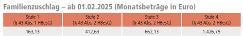 Der kinderbezogene Anteil im Familienzuschlag beträgt für die ersten beiden zu berücksichtigenden Kinder jeweils 249,50 Euro, das dritte und jedes weitere zu berücksichtigende Kind jeweils 764,66 Euro |